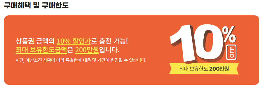 - 구매 한도: 개인 월 100만원 (할인 포함)